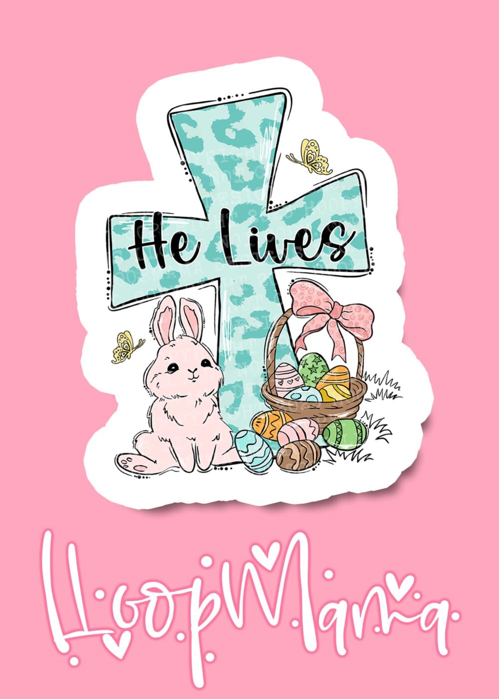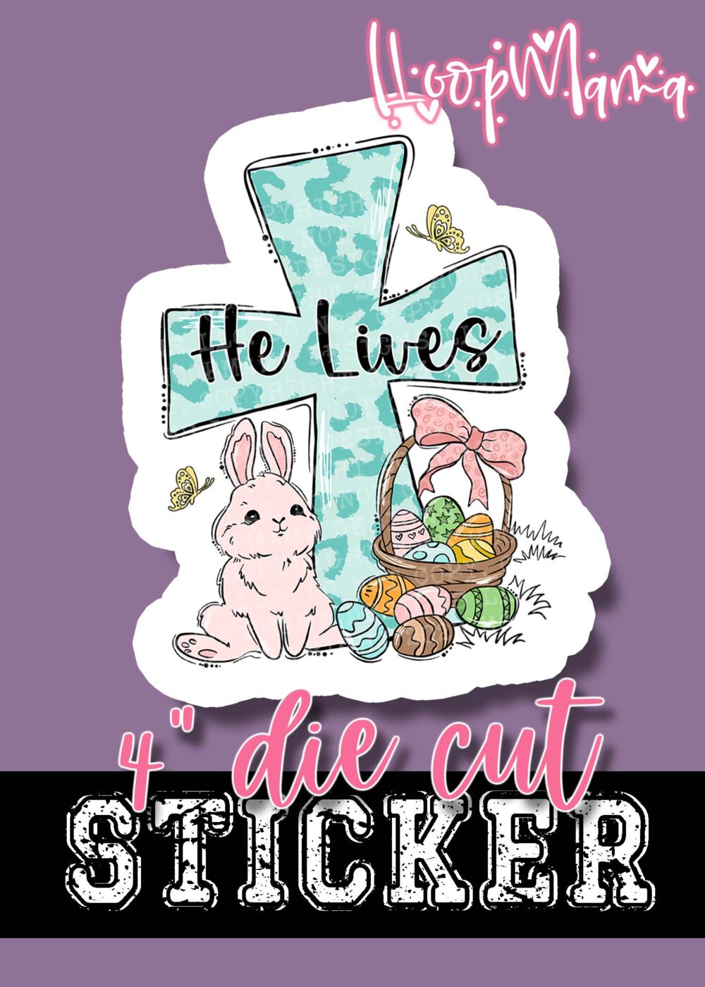 DC23-0195- He Lives Bunny Cross – DIE CUT STICKER