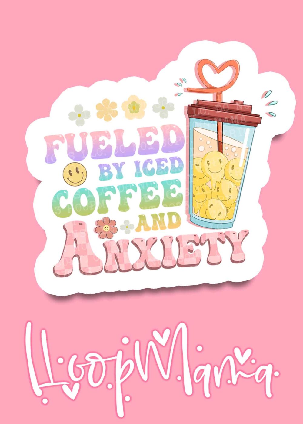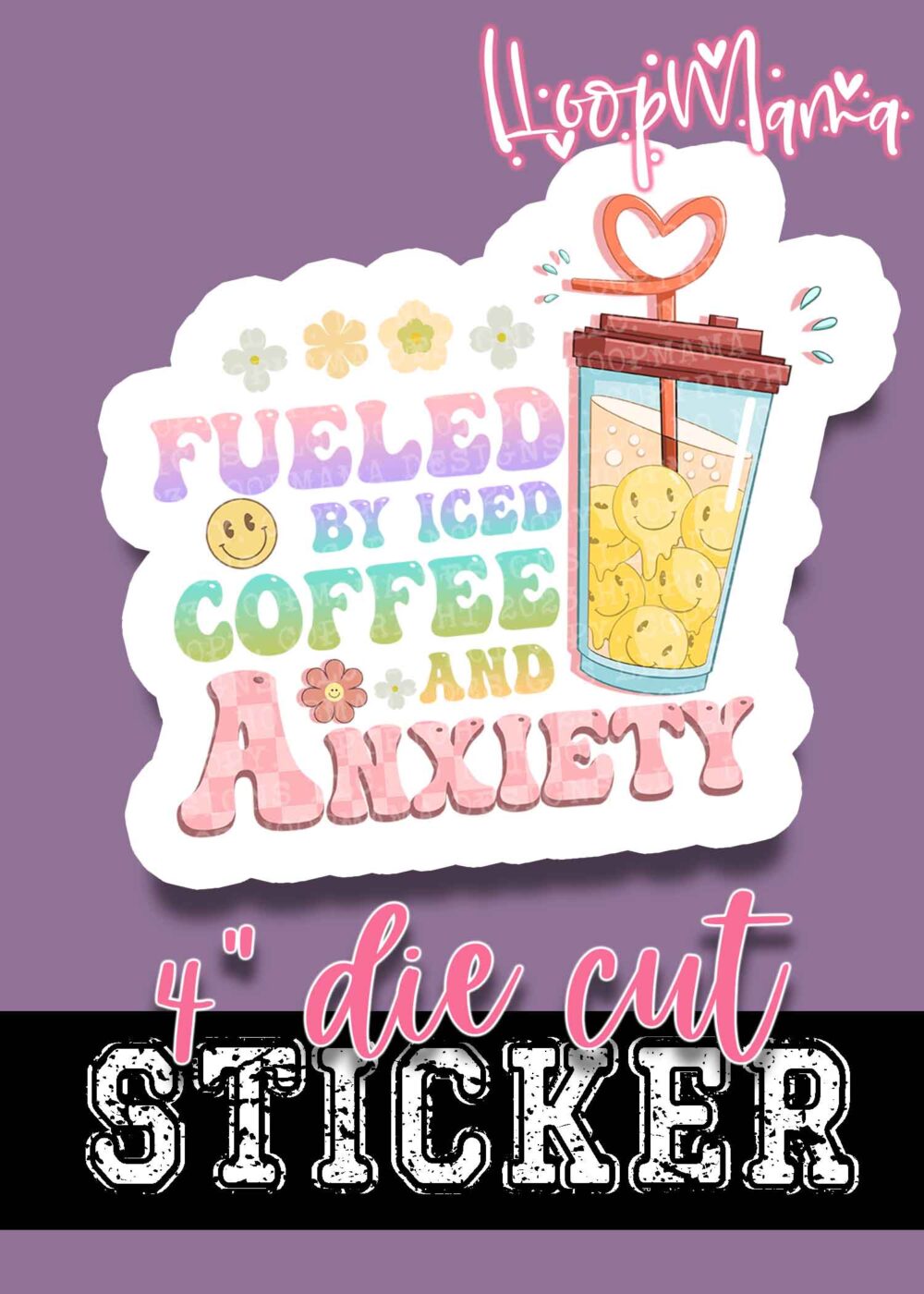 DC23-0426 – Fueled By Iced Coffee And Anxiety – DIE CUT STICKER