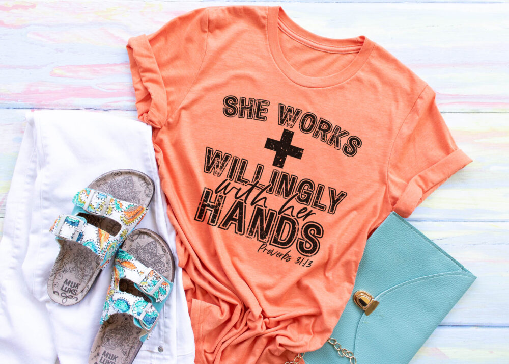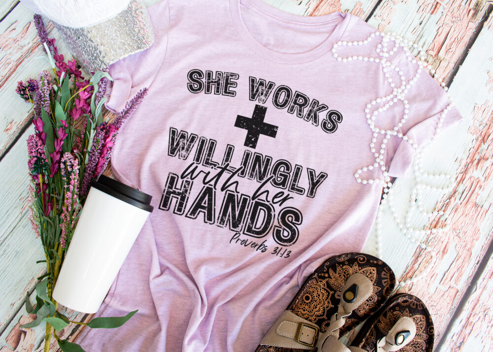 SPT-E3C1 – She Works Willingly – BLACK- 10.5″ – SCREEN PRINT TRANSFER