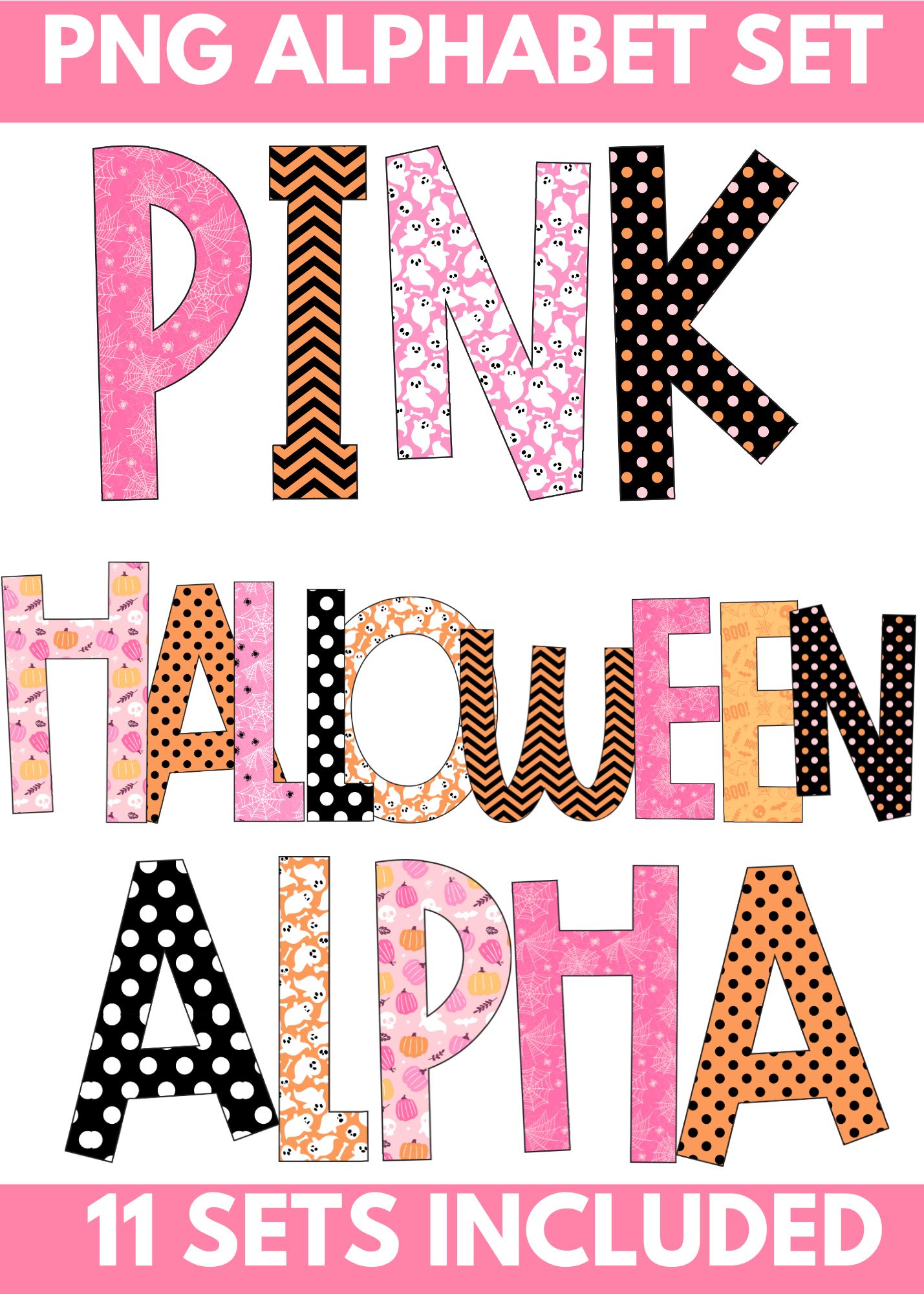 Pink Halloween PNG Alpha Font – 11 Complete Sets – DIGITAL DOWNLOAD