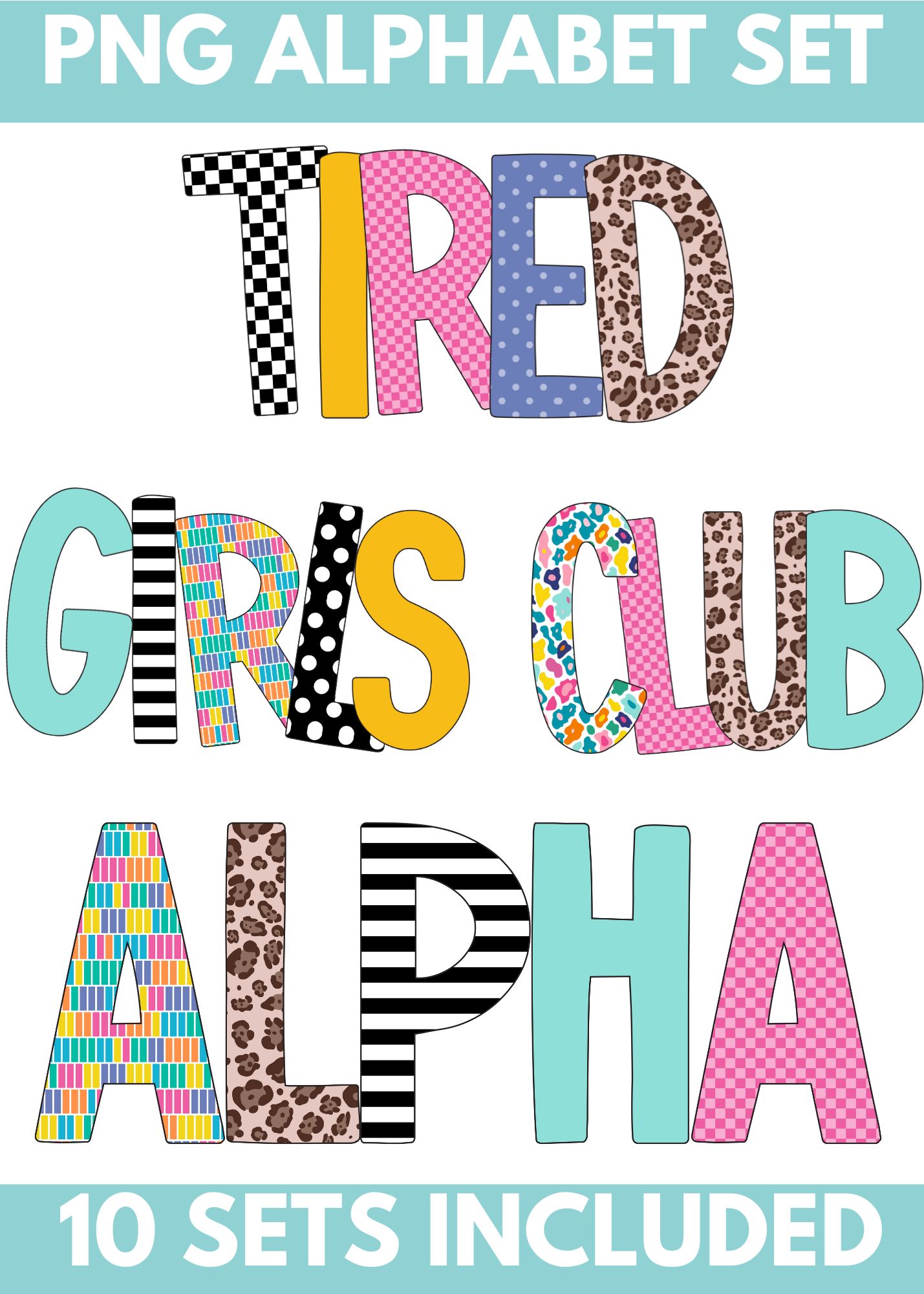 Tired Girls Club – Bright Summer PNG Alpha Font – 10 Complete Sets – DIGITAL DOWNLOAD